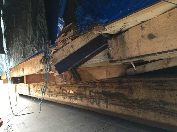 的大型设备货物,重量43吨,由于在长途运输过程中,整个木箱底部滑木断裂。